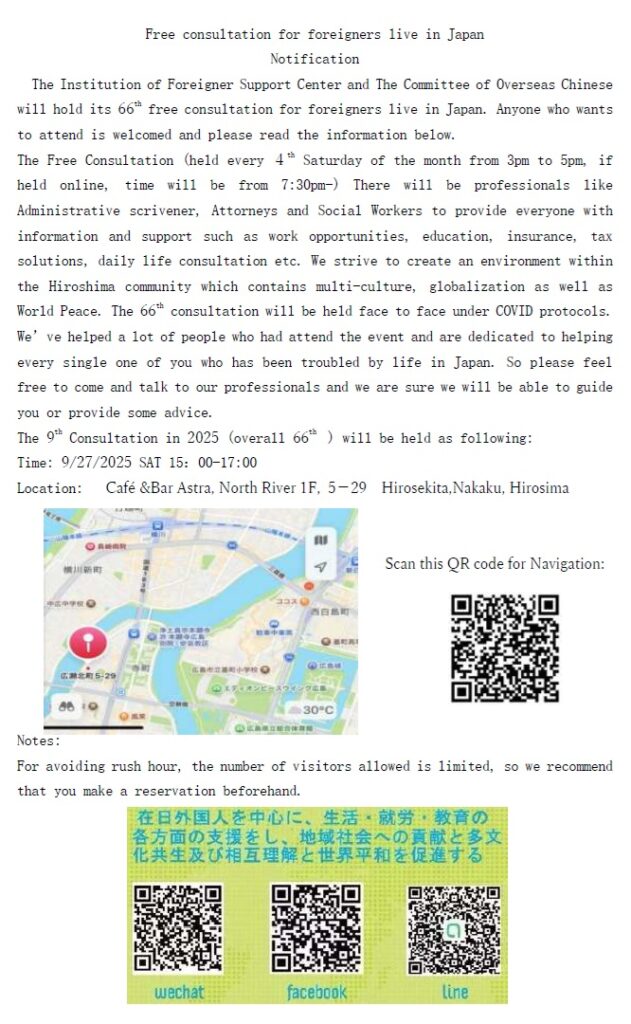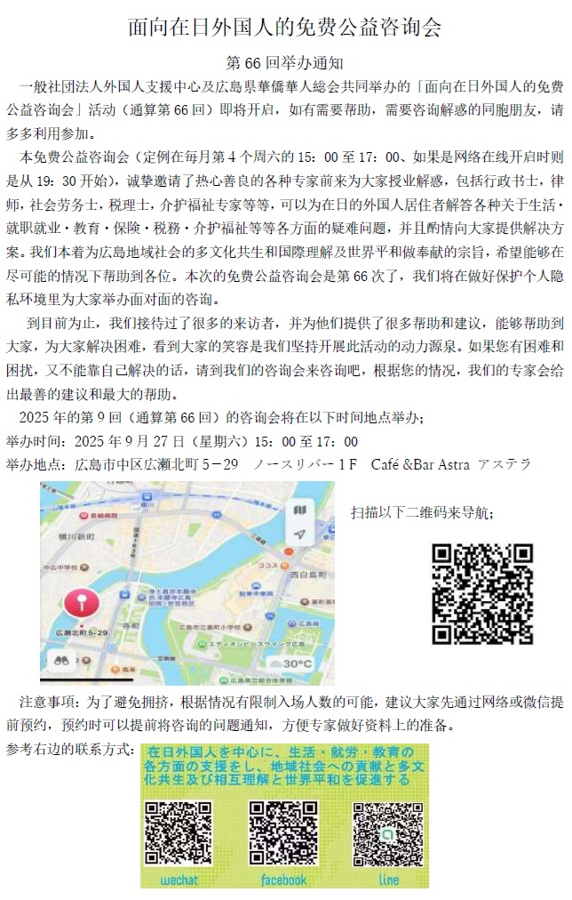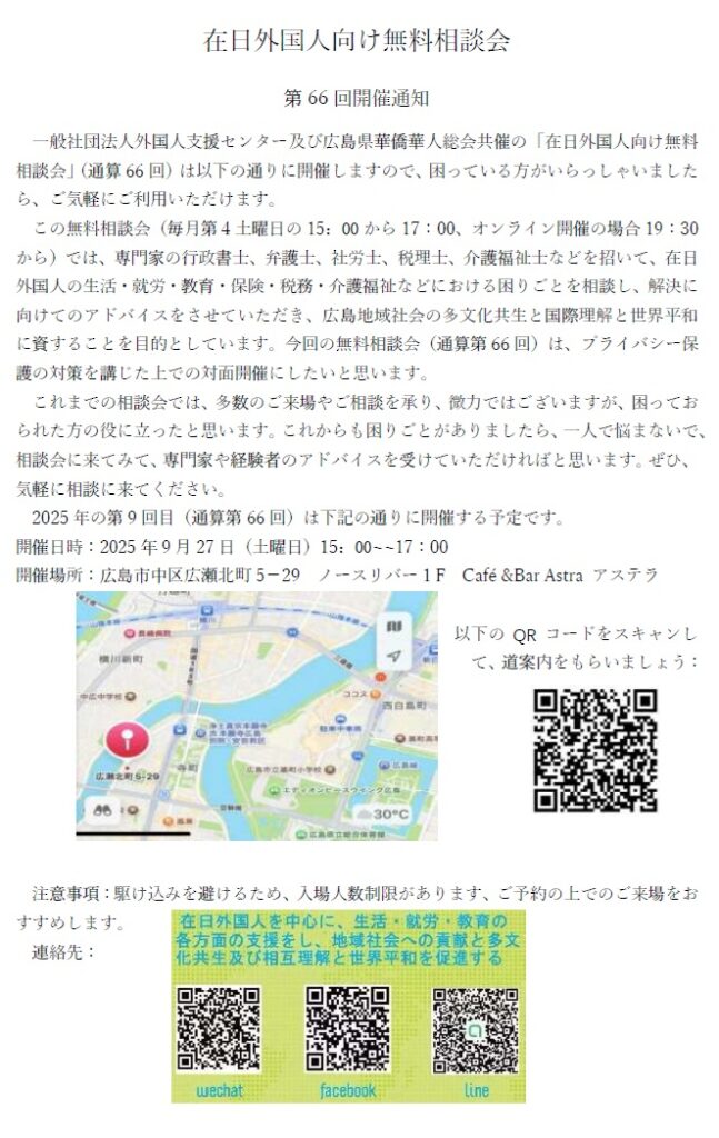広島在住外国人生活情報サイト lang menu HOME 暮らしお助け動画集 生活に役立つ情報 在留資格 市町の役場での手続き 働く 出産・子育て 学校 日本語を学ぶ 病気・ケガ 年金・福祉 税金 交通 住宅 観光 その他・生活のルール 生活ガイドブック 相談窓口 緊急 病院を探す・救急車を呼ぶ 警察を呼ぶ 消防車を呼ぶ 災害情報を知る 外国人コミュニティ・キーパーソン プライバシーポリシー Languages お知らせ詳細 9月27日(土) 外国人無料相談会のお知らせ 2025年(ねん)09月(がつ)24日(にち) 9月27日に、広島市で、外国人への無料相談会があります。生活や仕事などの困りごとを、相談することができます。一般社団法人外国人支援センターと広島県華僑華人総会が相談を行います。 【日時】2025年9月27日(土)15:00~17:00 【場所】広島市中区広瀬北町5-29 ノースリバー 1F café&bar アステラ(ASTRA) くわしくは、チラシを見てください。 お知らせ一覧に戻る TOPページに戻る