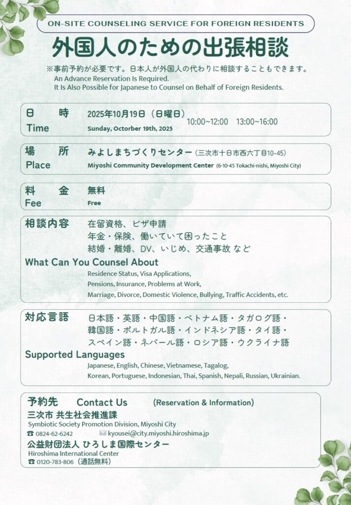 三次市に 在住している 外国人の方を 対象に 出張相談窓口を 開設します。