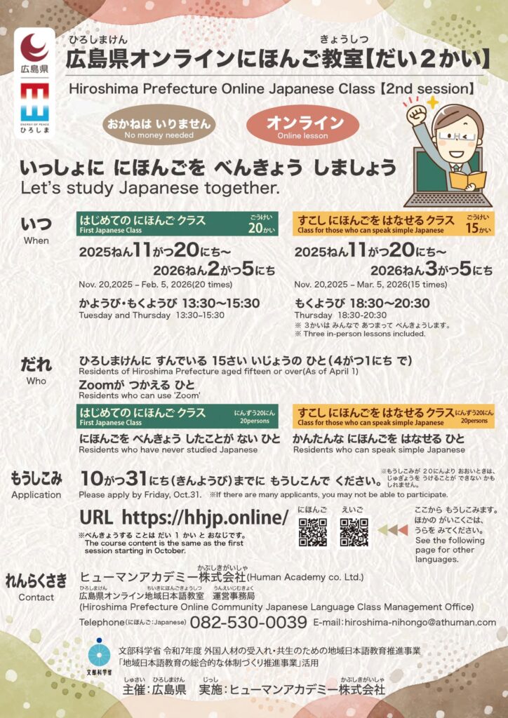 広島県は 11月から オンラインで 2回目の 地域日本語教室を はじめます。