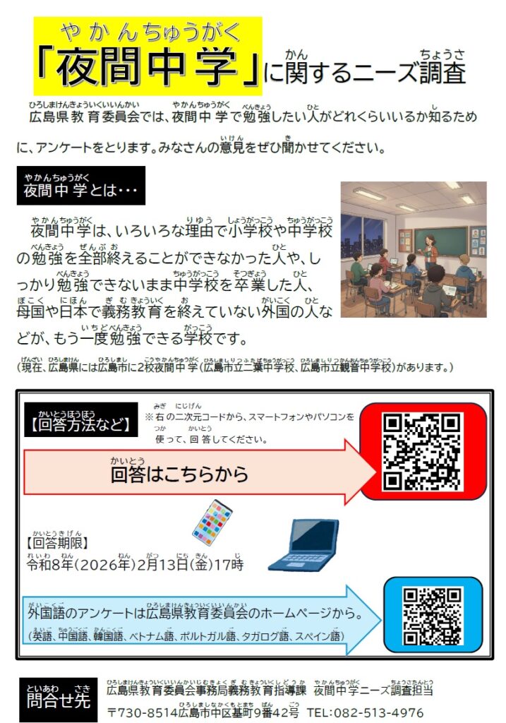 広島県に住む外国人のみなさま!「夜間中学」に関するアンケートに協力をお願いします。