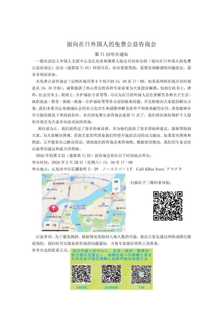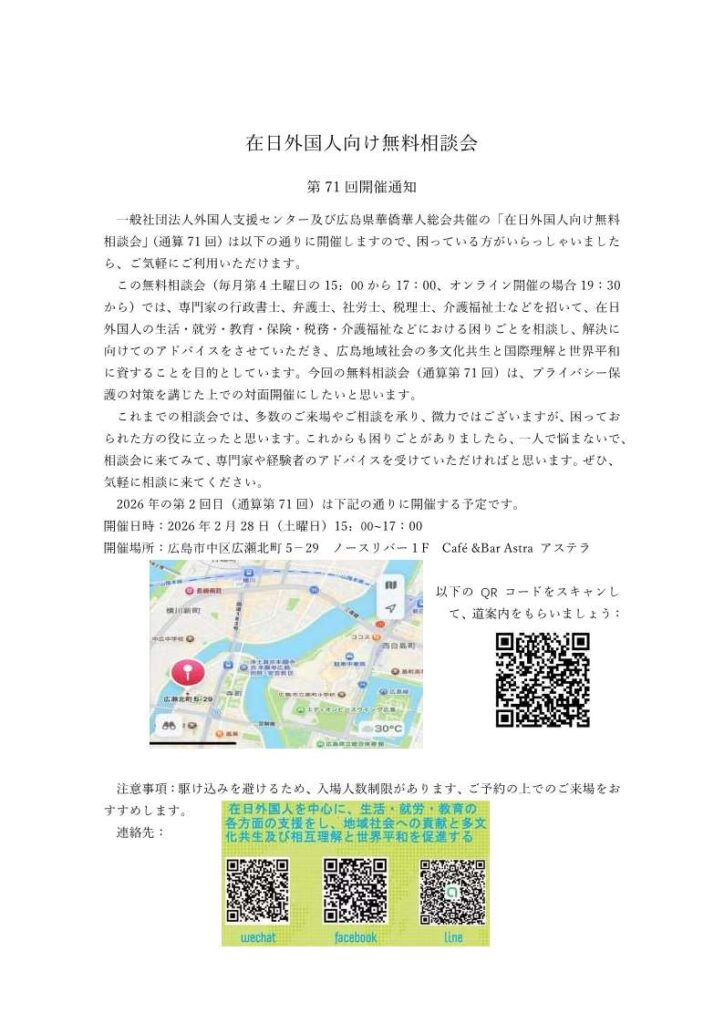 広島在住外国人生活情報サイト lang menu HOME 暮らしお助け動画集 生活に役立つ情報 在留資格 市町の役場での手続き 働く 出産・子育て 学校 日本語を学ぶ 病気・ケガ 年金・福祉 税金 交通 住宅 観光 その他・生活のルール 生活ガイドブック 相談窓口 緊急 病院を探す・救急車を呼ぶ 警察を呼ぶ 消防車を呼ぶ 災害情報を知る 外国人コミュニティ・キーパーソン プライバシーポリシー Languages お知らせ詳細 2月28日(土) 外国人無料相談会のお知らせ 2026年(ねん)02月(がつ)25日(にち) 2月28日に 広島市で 外国人への無料相談会があります。生活や 仕事などの 困りごとを 相談することができます。一般社団法人外国人支援センターと 広島県華僑華人総会が 相談を行います。 【日時】2026年2月28日(土)15:00~17:00 【場所】広島市中区広瀬北町5-29 ノースリバー 1F café&bar アステラ(ASTRA) くわしくは チラシを 見てください。 お知らせ一覧に戻る TOPページに戻る